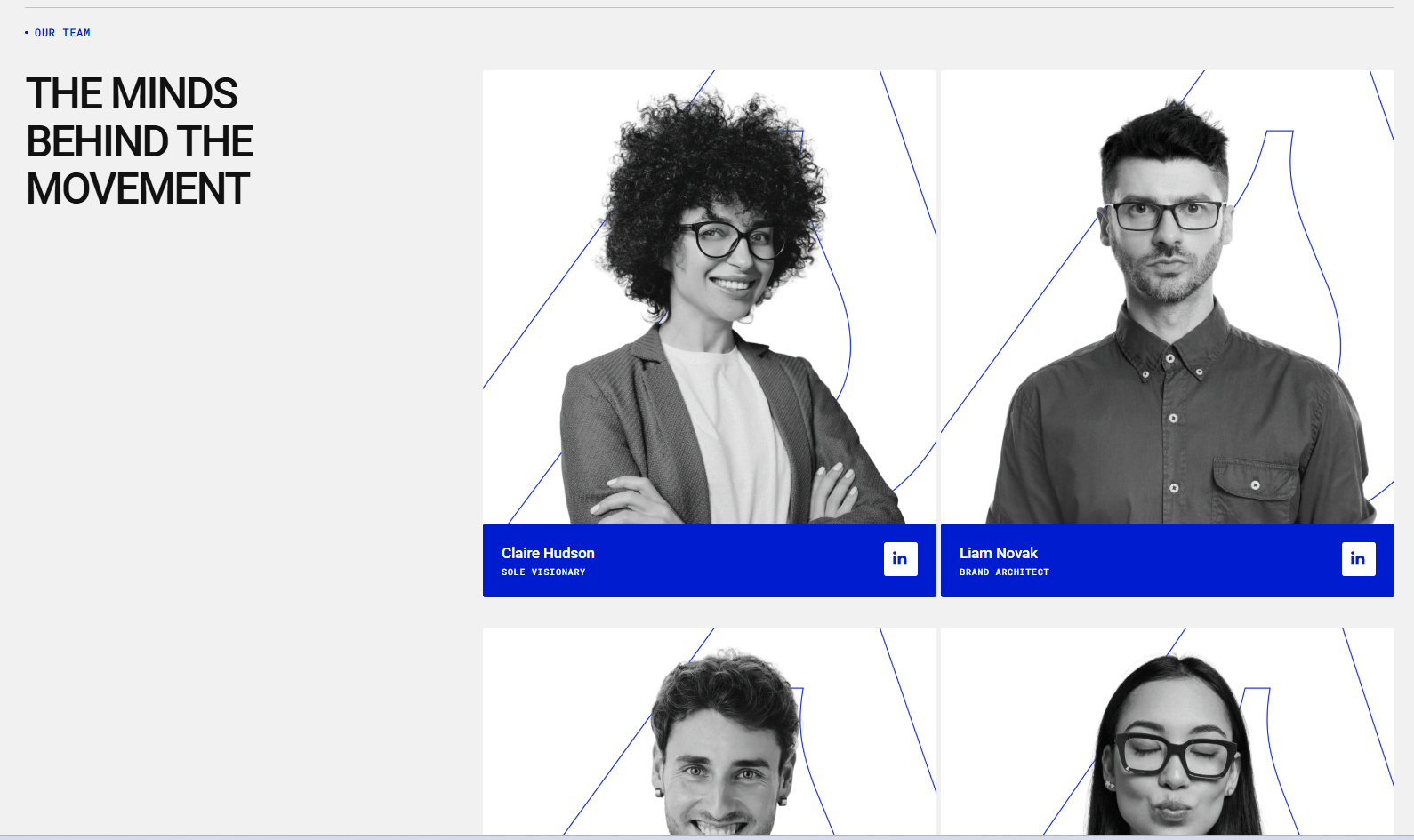 Example 3: Team Members Layout — This layout is designed to showcase team members, including their name, position, and a link to their LinkedIn profile.