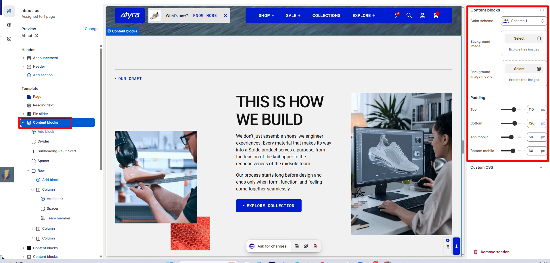- Column block exists inside a Row block and it can also contain its own sub-blocks: Subheading, Heading, Text, Divider, Spacer, Timeline group, Details with icon, Details with text, Product card hotspot, and Team member.