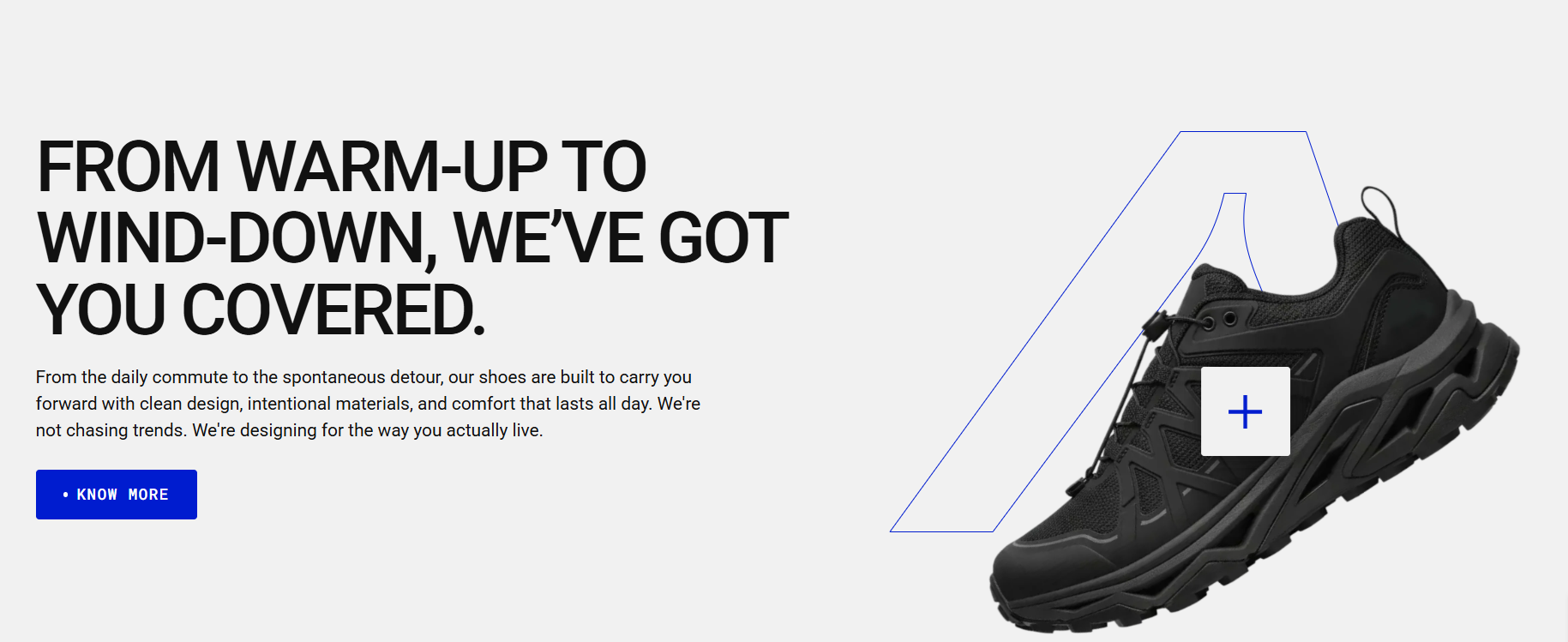 Example 7: This layout features two columns. The left column includes heading, text, and button blocks, while the right column contains a Product Card Hotspot block. A product background image and product image are added, allowing users to review the product by clicking the hotspot. Depending on the settings, the product opens either in a quick-view popup or on the product detail page.