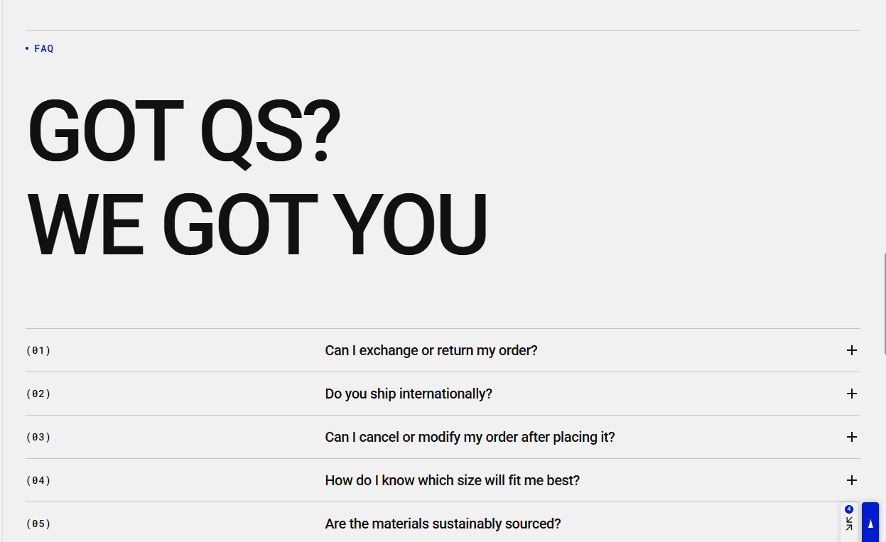 - Five collapsible content blocks, each containing a question and answer, allowing users to expand or collapse content as needed.