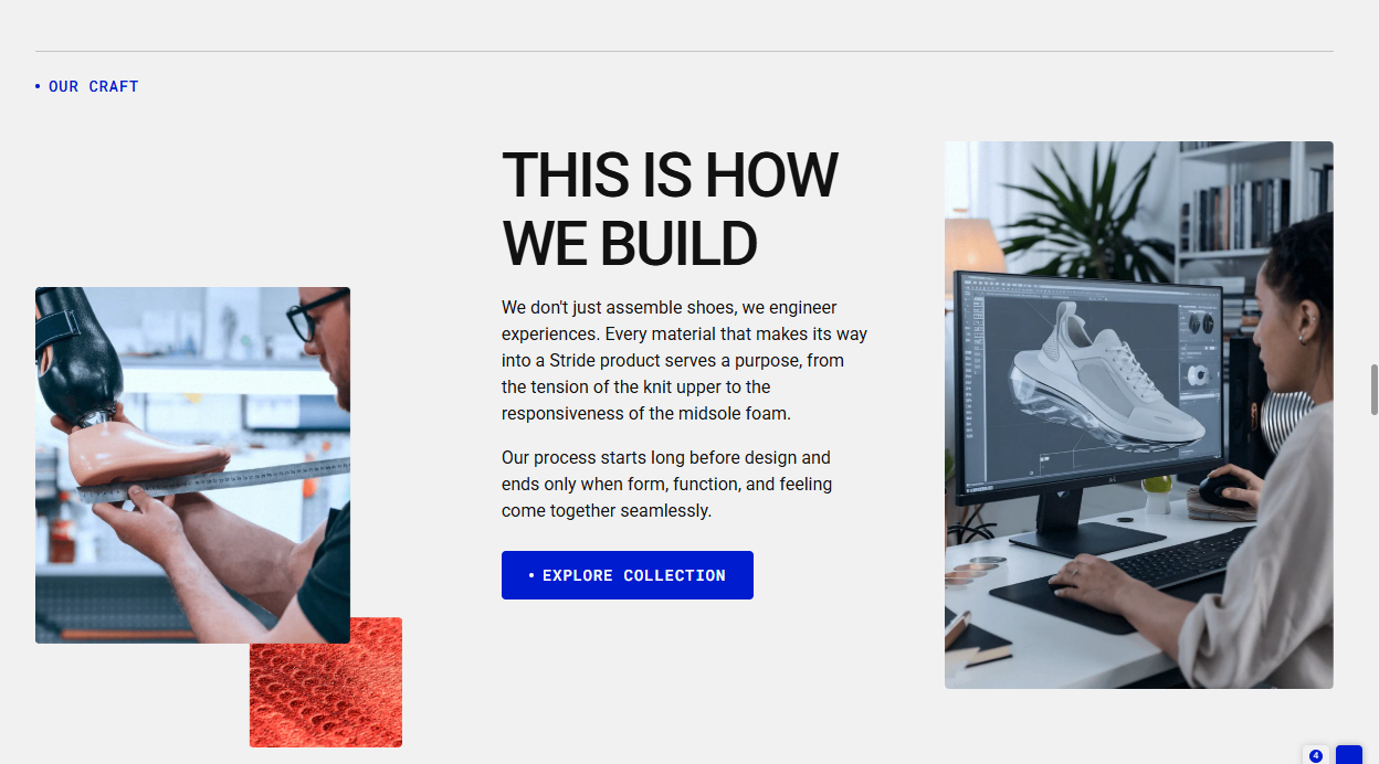 Example 1: A short story about a product and its creation process. This layout features multiple blocks, with the main structure Row block divided into three columns.