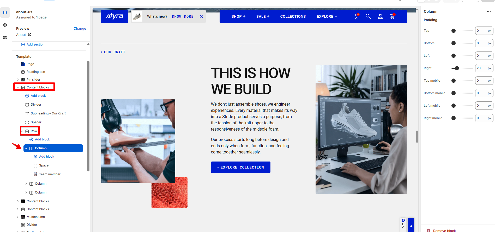 In the Content blocks section, the Column block exists inside a Row block and provides options for adjusting padding. It can also contain its own sub-blocks: Subheading, Heading, Text, Divider, Spacer, Timeline group, Details with icon, Details with text, Product card hotspot, and Team member.