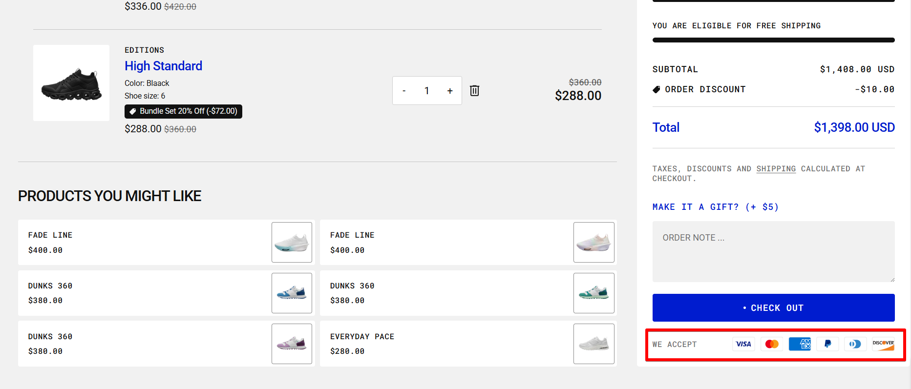 - Displays the accepted payment cards (e.g., Visa, Mastercard, American Express, PayPal and others)