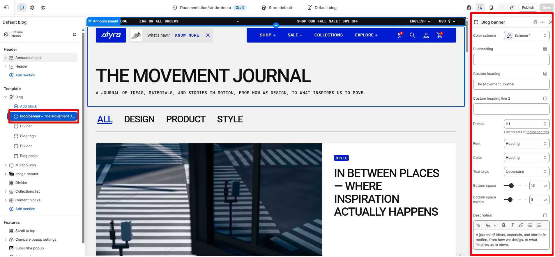 | Left space | Adds left spacing to the first line of the blog banner heading. |