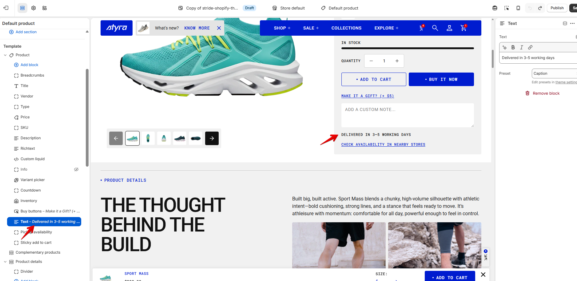 Add text in the Product section - Content block. This can include information such as delivery details.