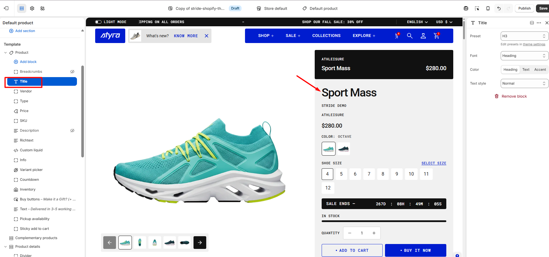In Theme Settings → Typography → Fonts, you can set font settings for Headings. Choose which style to apply in this block.
