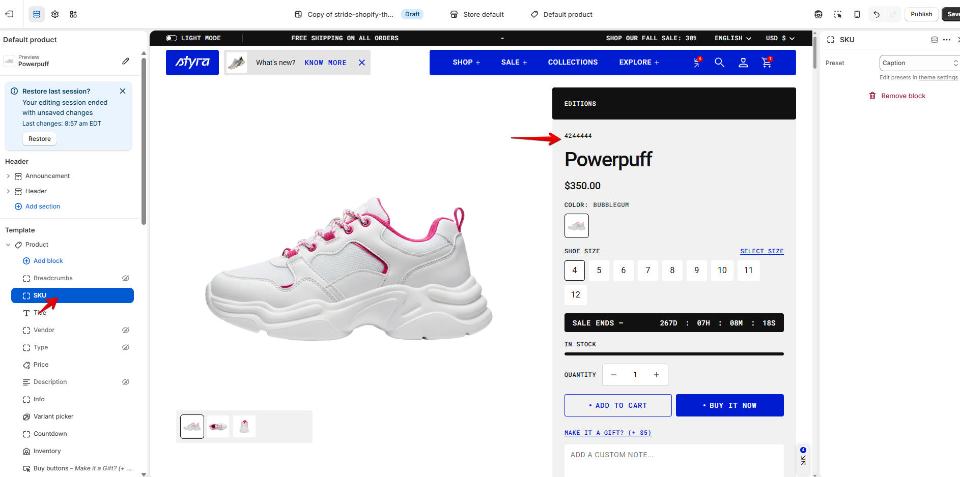 - Integrate a “SKU” block into the Product section by clicking on “Add to block”.