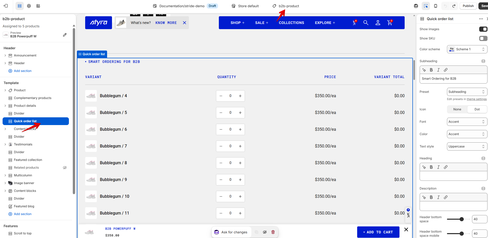 The Quick Order List section in a Shopify store is a feature designed to streamline the ordering process by allowing customers to quickly add multiple product variants to their shopping cart. This section can be added to the product detail template and is especially beneficial for customers who wish to purchase multiple variants of a product in a single step. This feature is particularly useful for stores with products that have numerous variants (e.g., color, size, material) and is a time-saving tool for both store owners and customers.