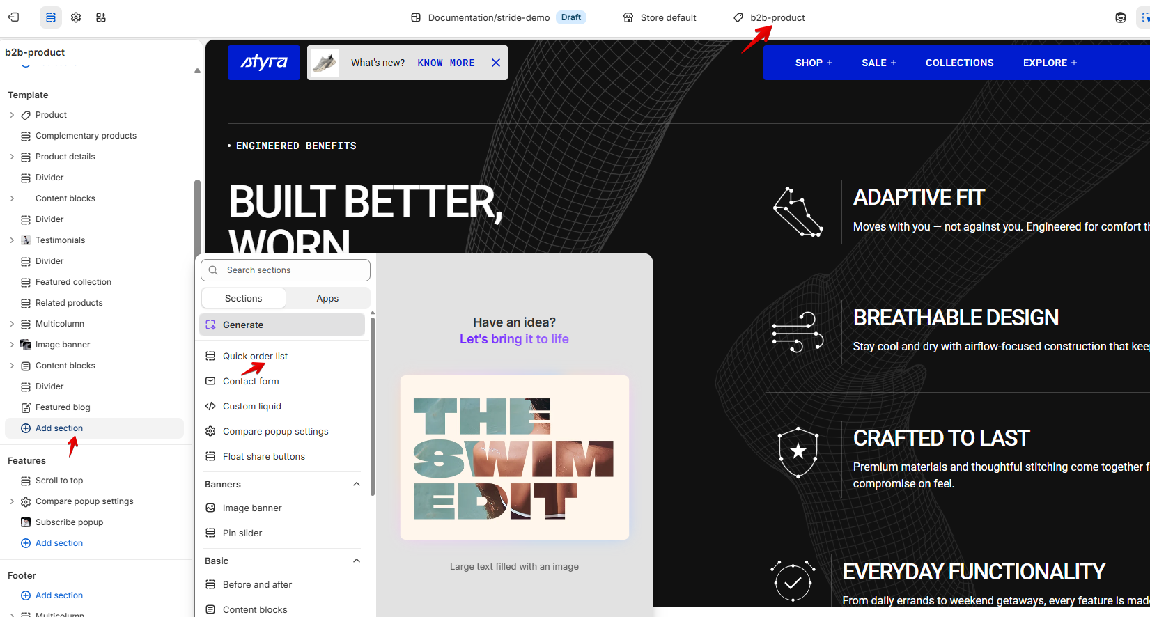 In the demo store, a separate template was created for the B2B product, and this section was added to that page.