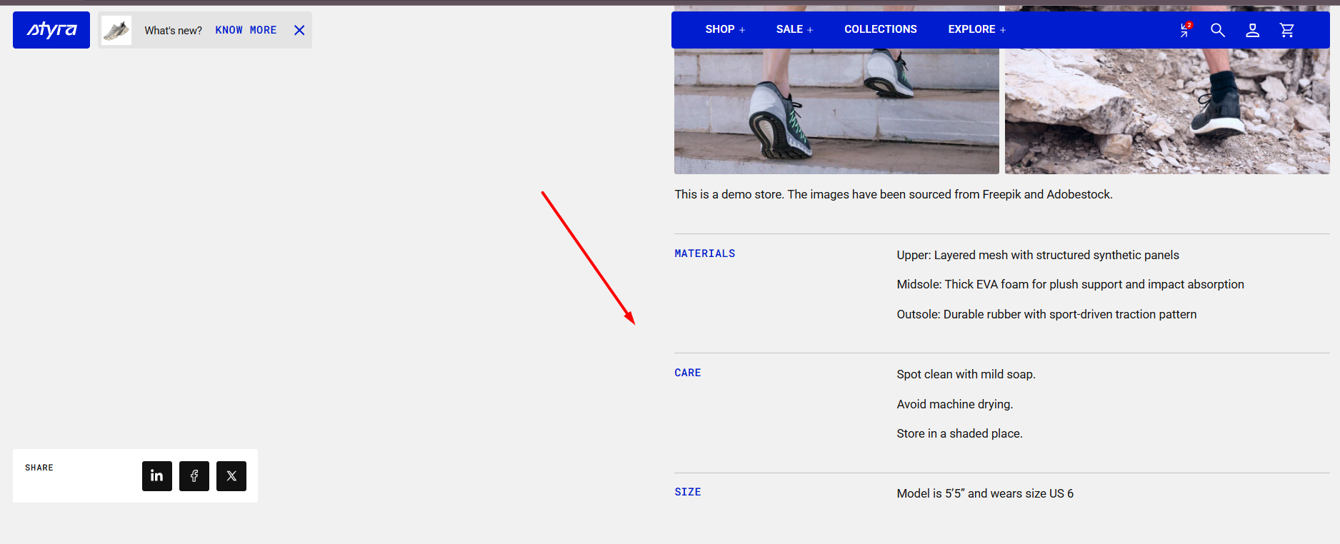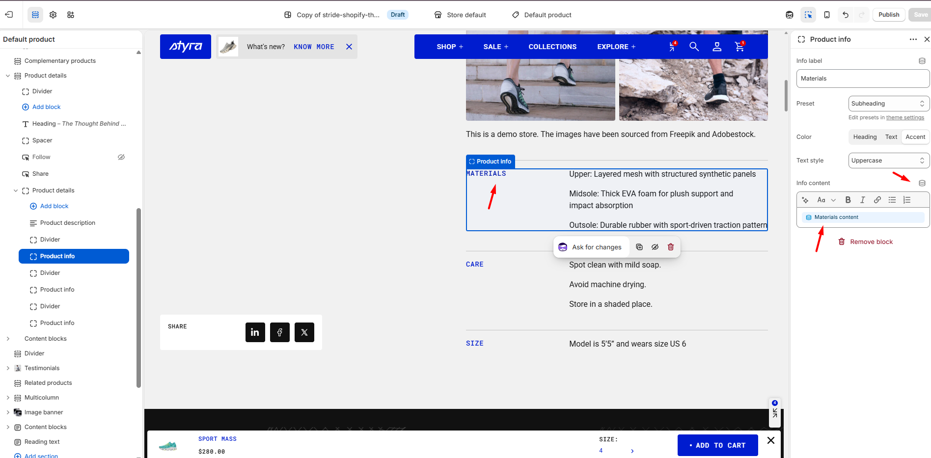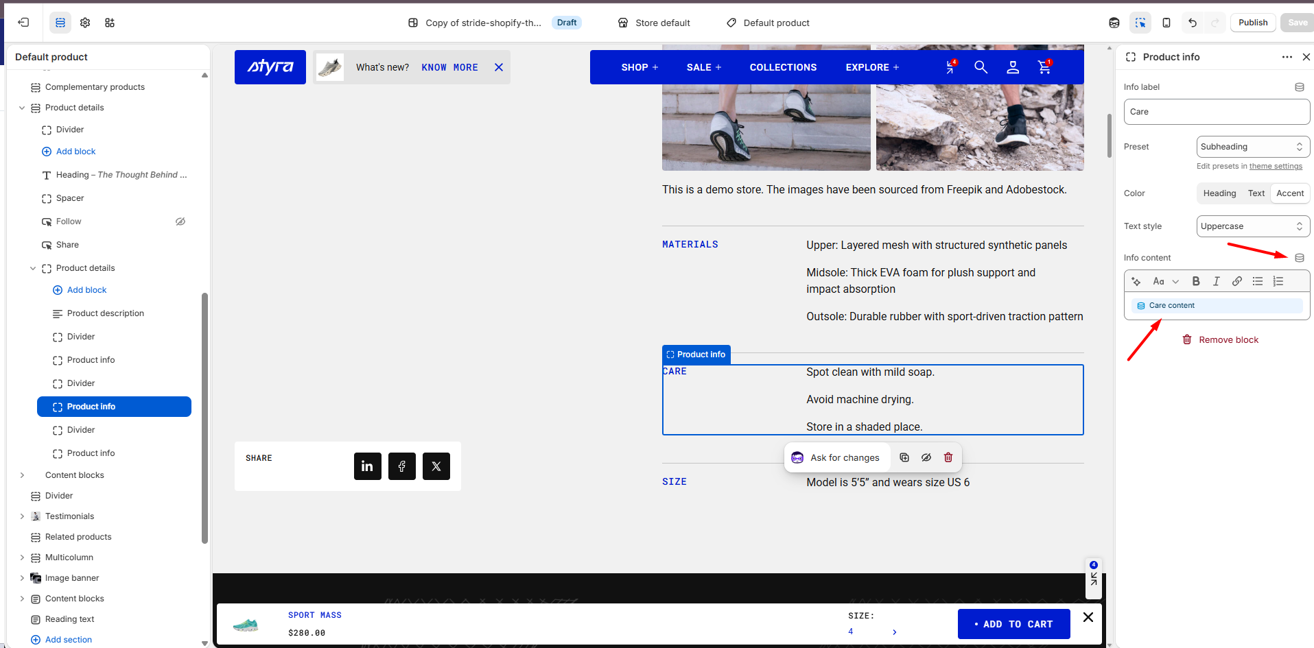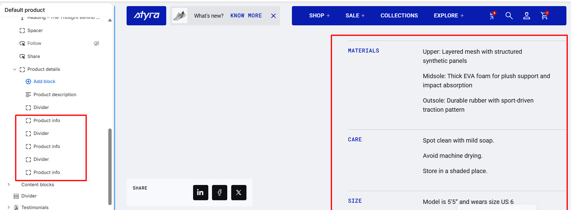 To display different content in this block, you can create a metafield and add it here using the “Connect dynamic icon” above the field. For example, in the demo, we have Material, Care, and Size Info, each with a corresponding metafield. Check the screenshots below for reference. |