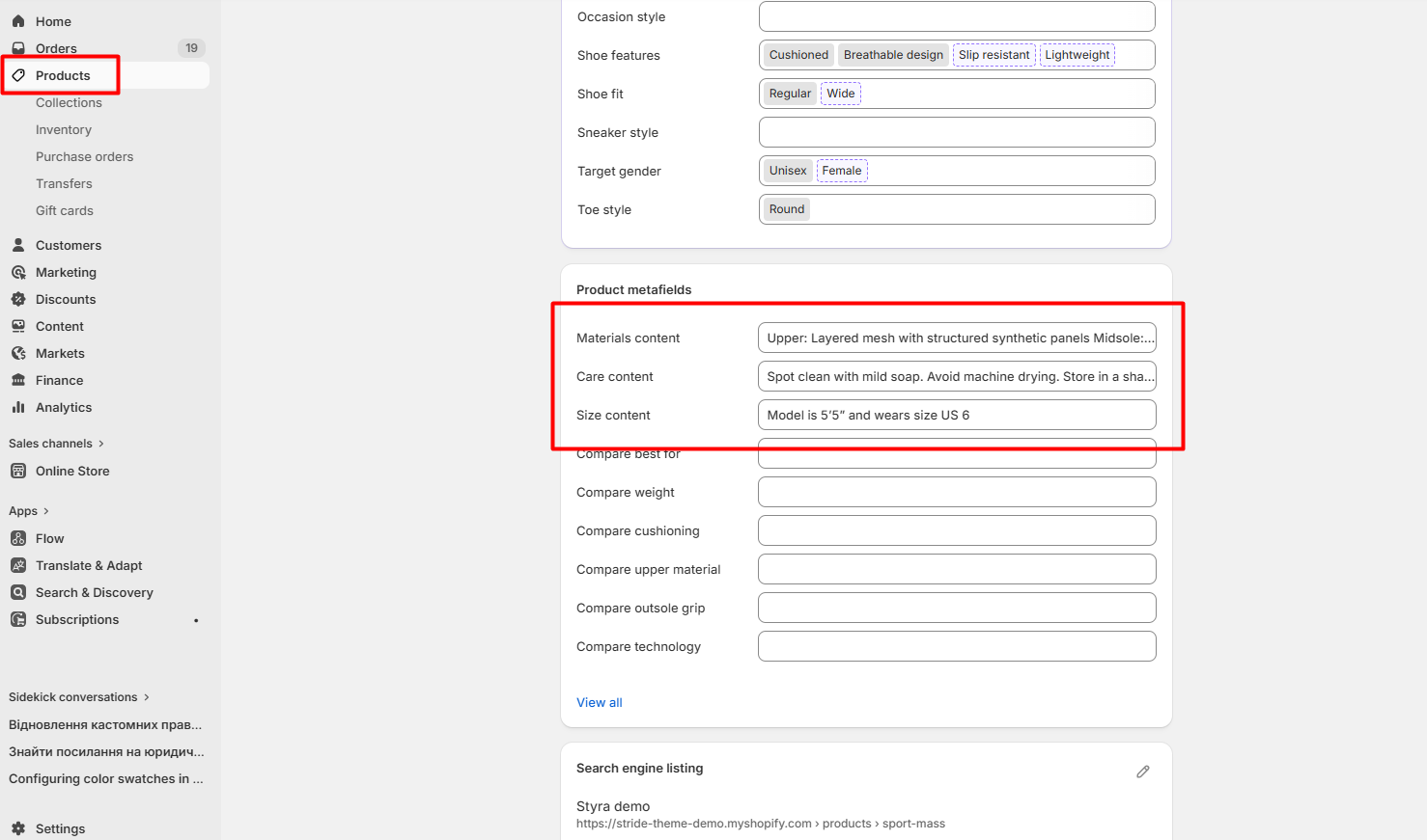 After this, navigate to Products → Each product page, scroll to the Product Metafields section, and add content for each product page.