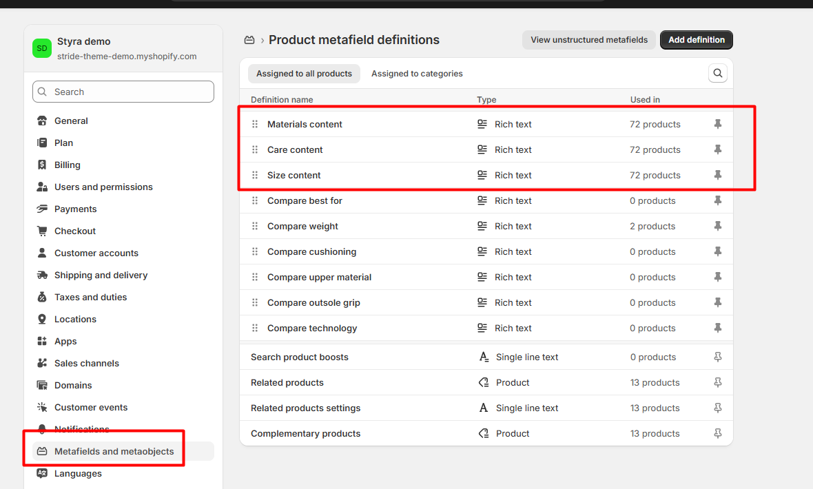 Navigate to Settings → Metafields and Metaobjects → Products → Definitions → Add definition.