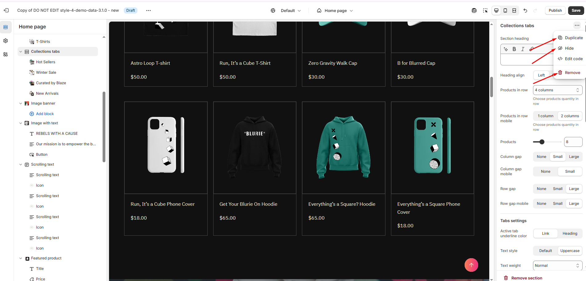 How to duplicate, hide, or remove when a section or block settings is opened on the left sidebar: